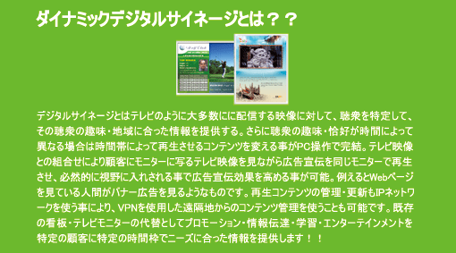 ネットワーク経由でモニターの管理が可能。店頭でのメディア交換を不要とし、タイムリーな情報が発信可能。インターネット回線を使用する事で、コンテンツの更新を自動で管理・変更する事が可能です。